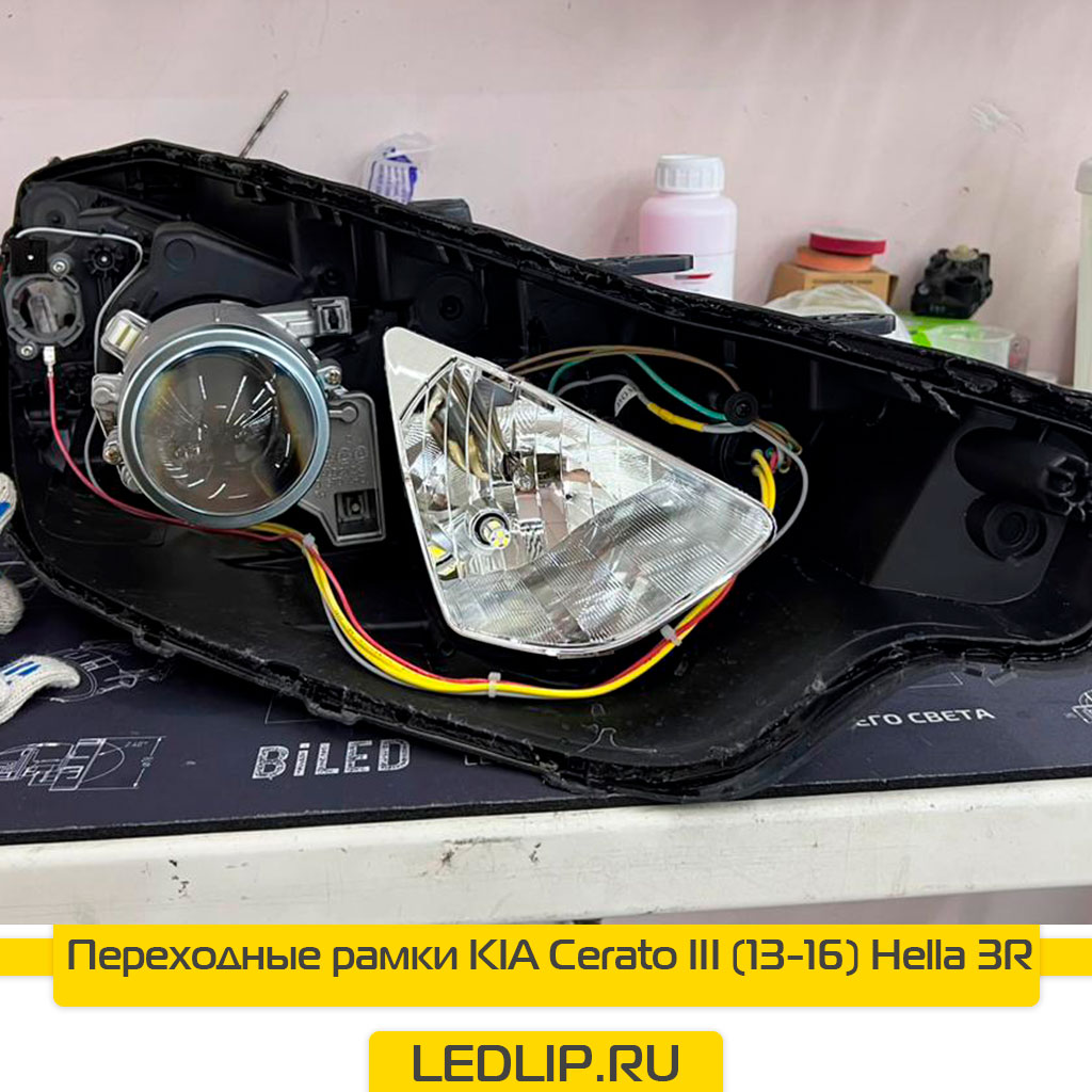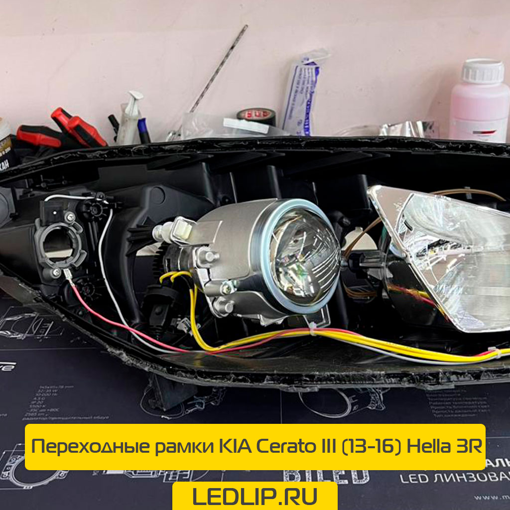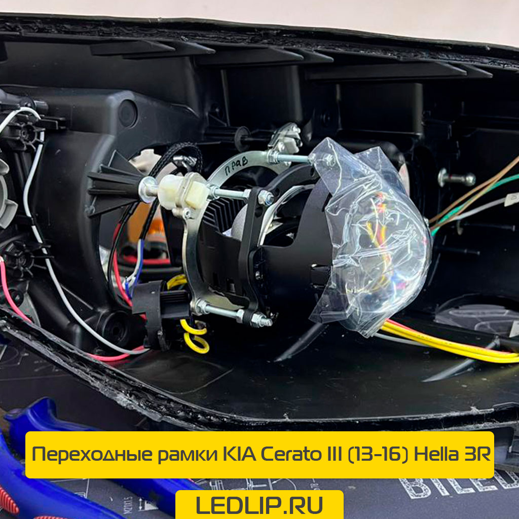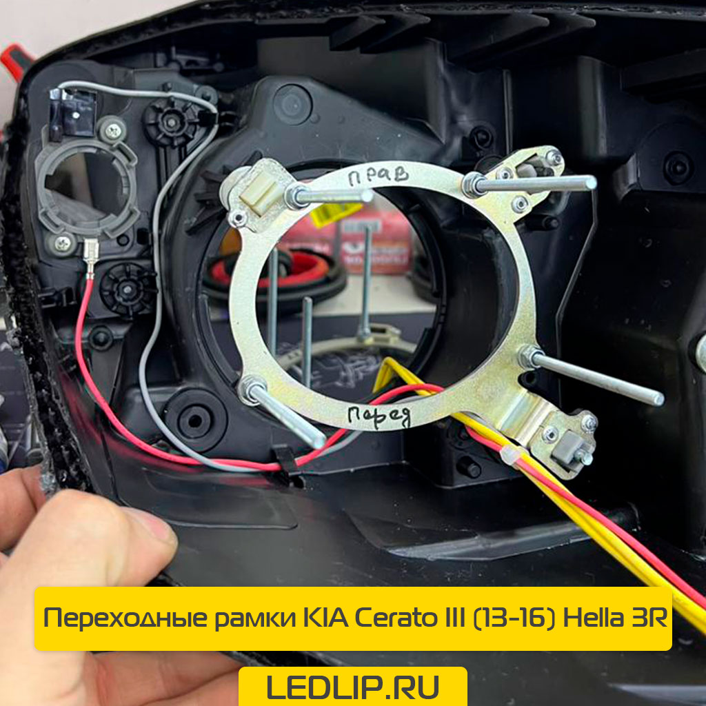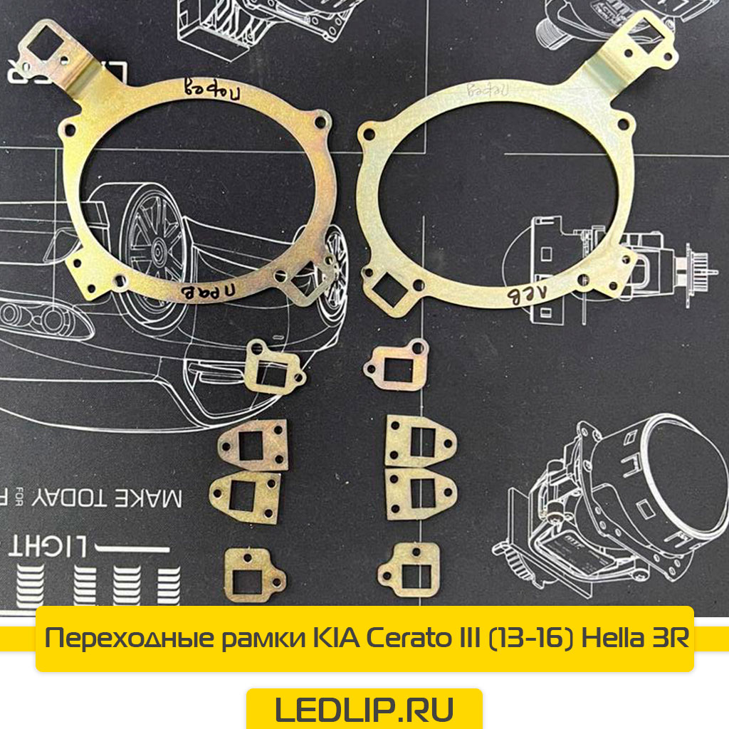 Комплект переходных рамок для замены штатных линз на линзы с креплением «Hella 3»: ксенон или светодиодные, таких марок как Aozoom, MTF, Optima, Dixel и тд. на автомобиле KIA Cerato III (2013-2016)
