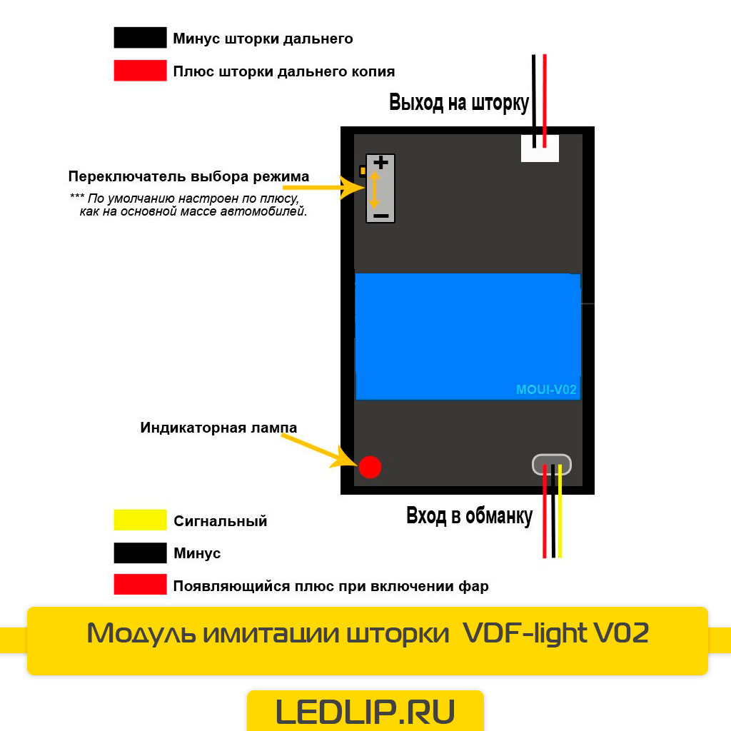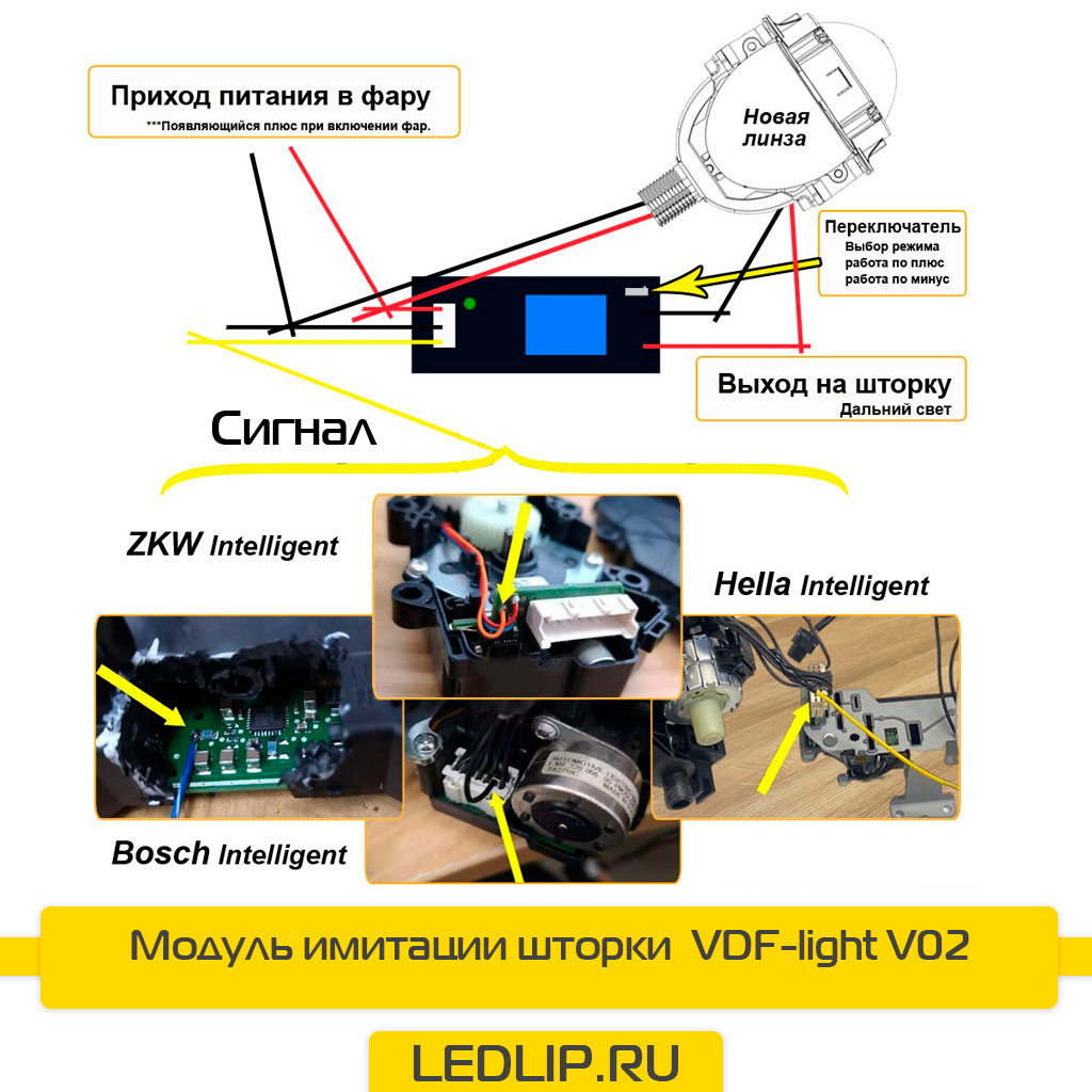 — Желтый провод на сигнальный плюс (штатной линзы) или мотора привода шторки.