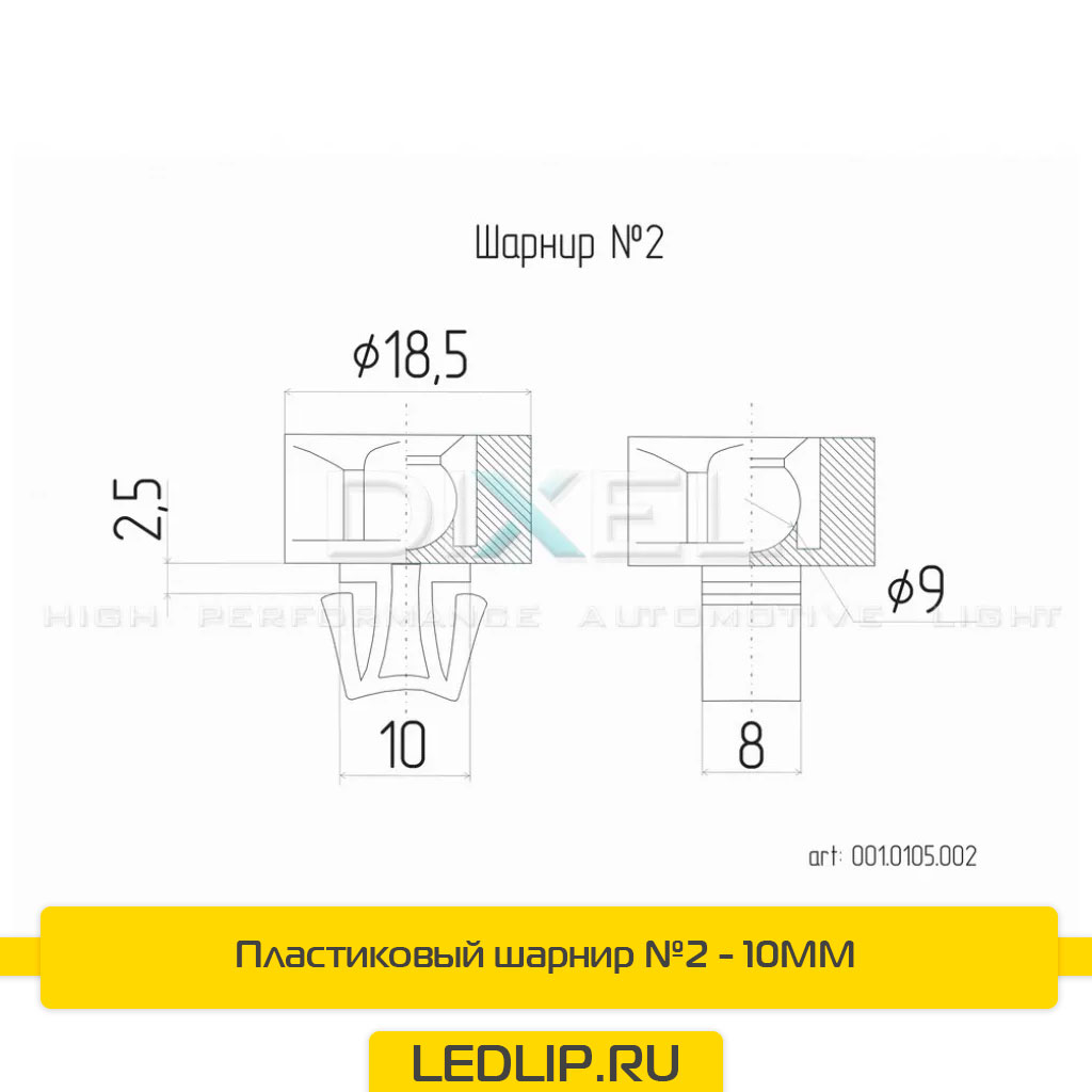 Пластиковый шарнир №2 — 10MM Артикул 001.0105.002 Под шарнир 10 мм Посадочное 10/8 мм Толщина посадки 2,5 мм Производитель Dixel